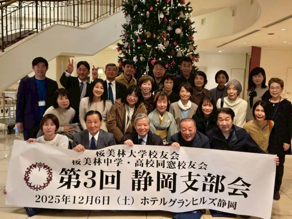 一人ひとりから母校への熱い思いが語られ、最後は学園歌の合唱とクリスマスツリー前での記念撮影で幕を閉じました。